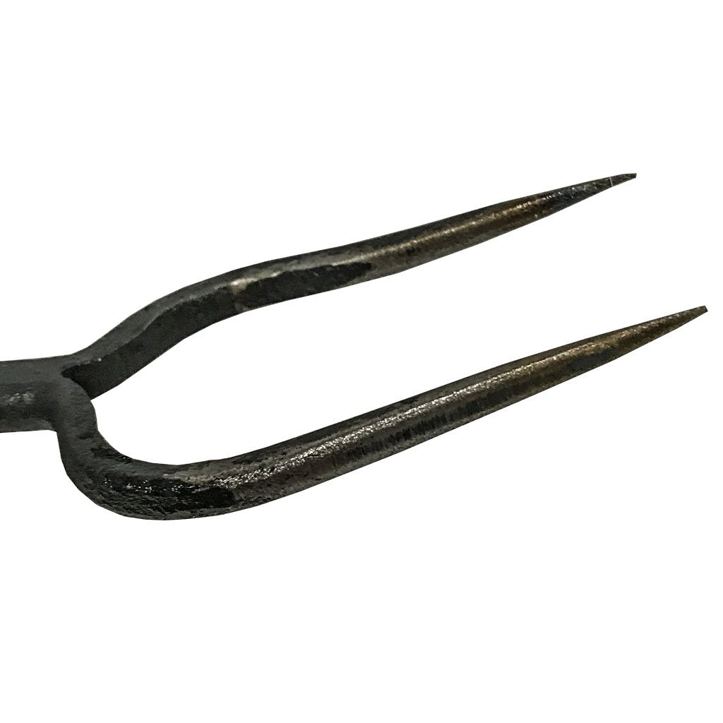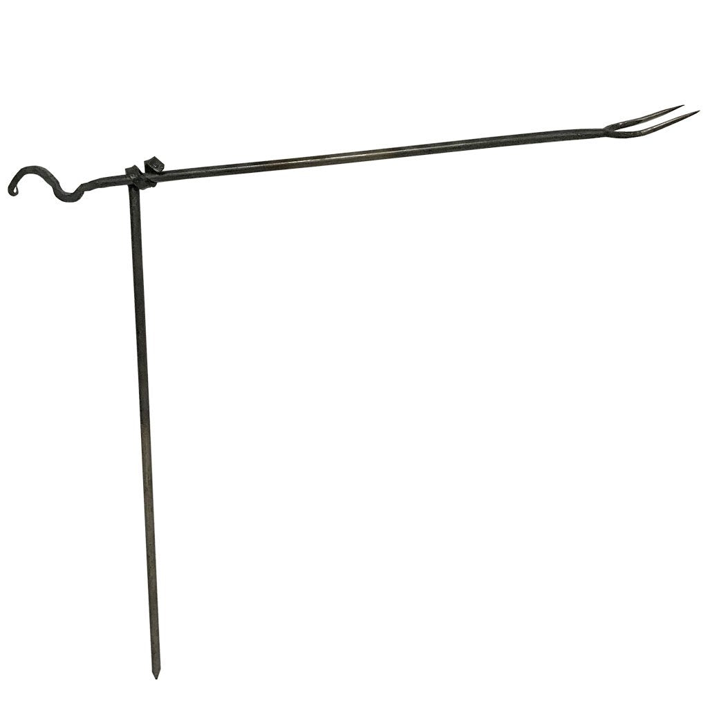 This squirrel cooker comes with a large fork end so you can cook the squirrel meat over the fire. The other end has a hook so you may use it to hold kettle, bush pot, or coffee pot. The forked piece is about 24 inches long, with 3 1/2" forks. The upright piece is about 22 inches long. Made from square stock.