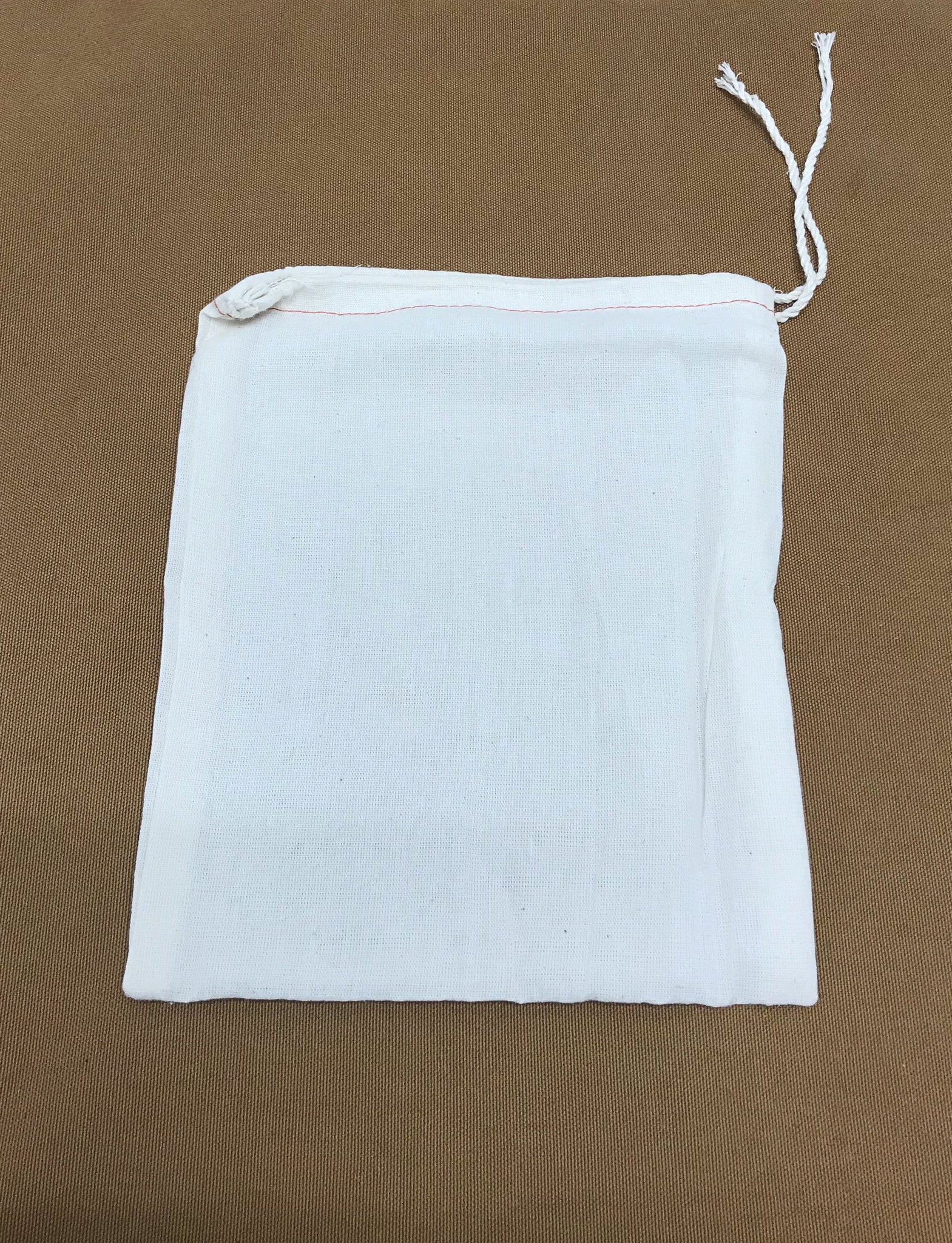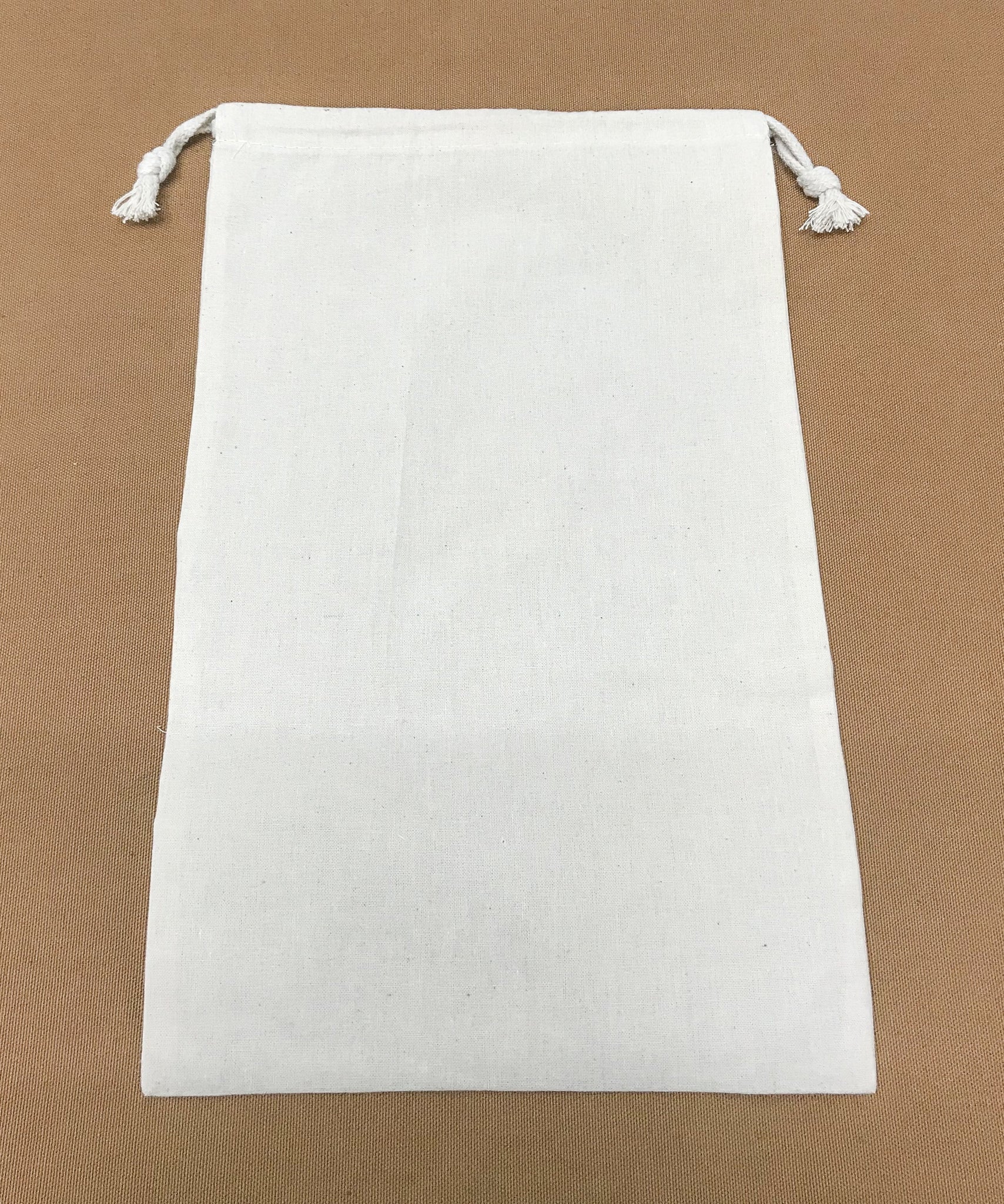 9" x 15" bag is an unbleached cotton muslin w/ double knotted cord.