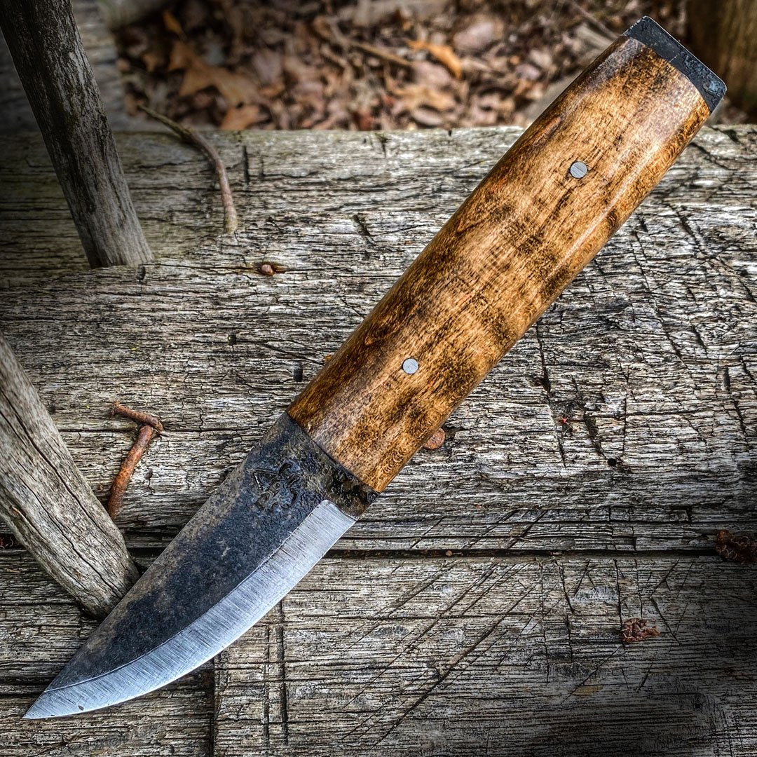The GB2 puukko is made from simple 1095 steel with a rugged forged finish; it replaces the hidden tang with a full tang; the flat spine has been sharpened to a crisp 90-degrees for processing tinder and striking a ferrocerium rod, and the tang is exposed on the end and has that same 90-degree so that it can be used for the same purposes; the handle is made from humble wooden scales in curly maple. It maintains the continuous curve and scandi grind that makes it such an excellent cutting and slicing tool.