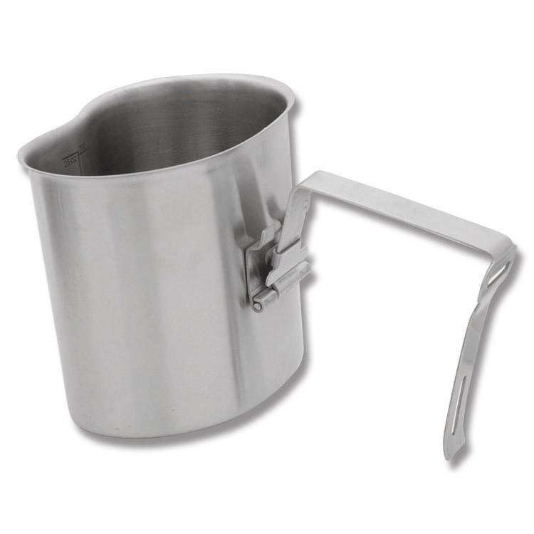 Your 2 primary concerns are always going to be hydration and core temperature regulation, that is why this kit is a must have in your pack. The Pathfinder Widemouth Military Style Canteen Cooking Kit was designed so the canteen will nest inside the cup along with the stove for convenient and compact storage. Not all containers are created equal, and in a survival situation, unless your container can withstand direct fire for the purposes of boiling/disinfecting water, the effects of water borne pathogens are quickly going to add to your list of troubles. Continuing to raise the bar, The Pathfinder School has developed the ONLY wide mouth stainless steel military canteen on the market today. The wide mouth design of this canteen allows you to easily obtain water from the shallowest of water pools, which will help conserve precious calories and energy that can be used to aid in your rescue or to affect your own self-rescue. The nesting cup has a folding handle that securely fastens the stove to the cup when not in use and has measurement graduations on the inside.