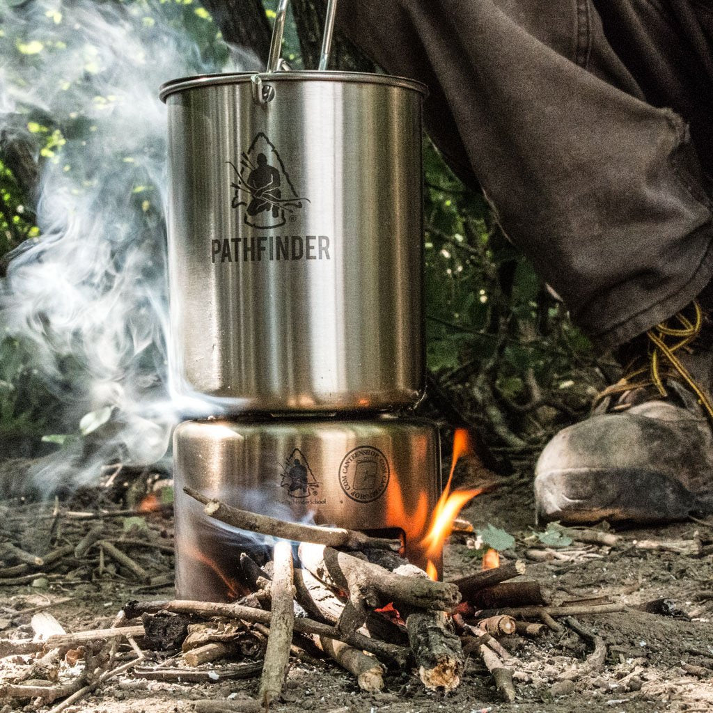 The Pathfinder Wide-mouth Stainless Steel Water Bottle was designed to hold exactly 32oz of liquid. The reason: Purification tablets are typically added to 32oz of water, that being the case, you can simply fill your bottle and add the tablets. No more measuring, no more worry. The nesting cup has fold-able heavy gauge "bat wing" handles with an opening large enough for a gloved hand and measurement graduations laser etched on the inside.